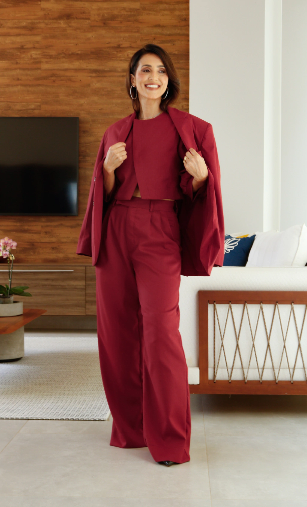 O blazer Ester é uma peça de roupa elegante e clássica. Constituido em alfaiataria clássica, possui ombreiras estruturando os ombros, lapela, manga longa, bolso frontal embutido e acabamento forrado.