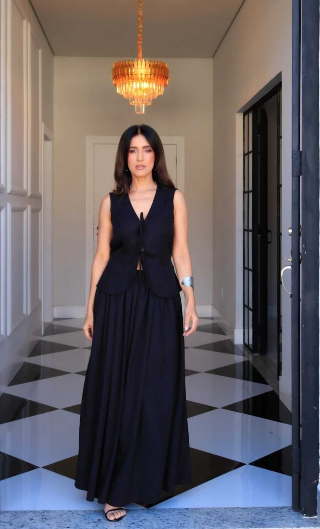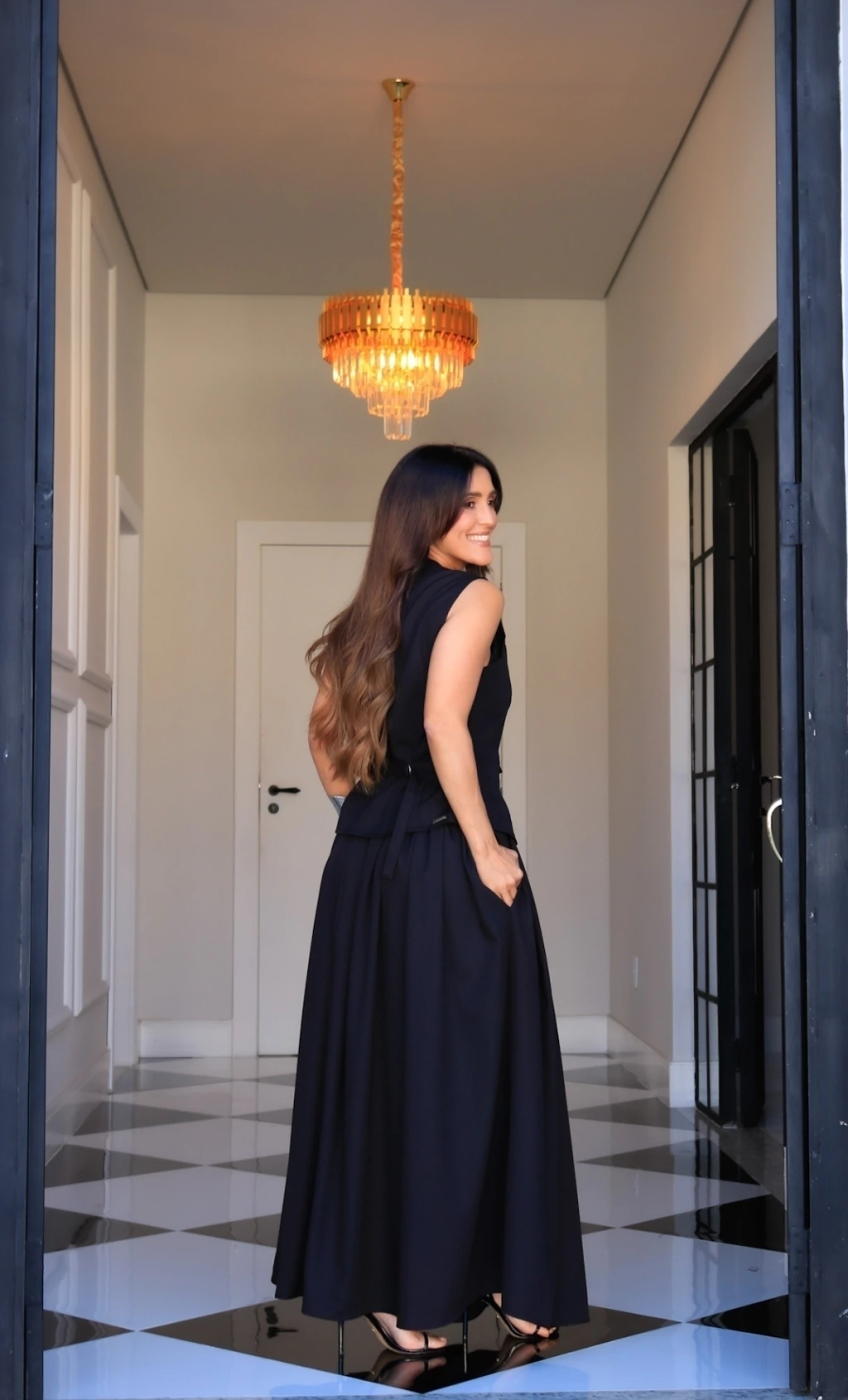 A peça é confeccionada em crepe, forrada com o mesmo tecido, possui bolso embutido e rolotê para amarrações.