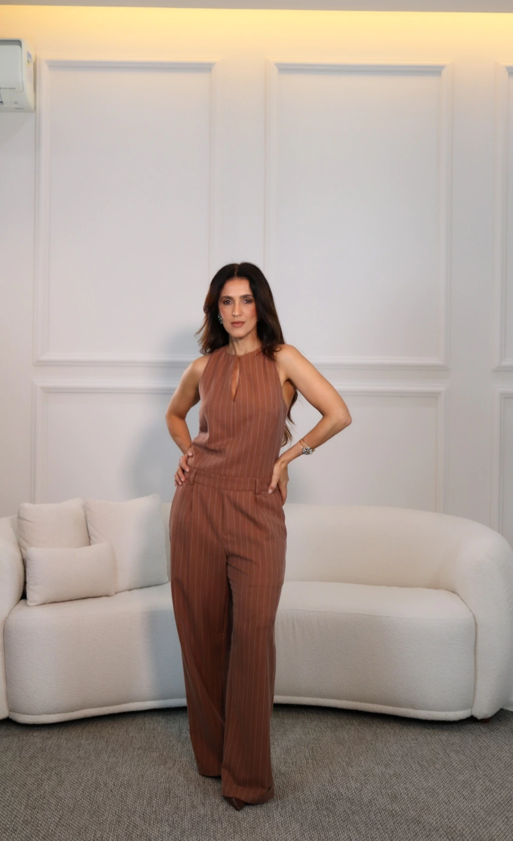 Macacao alfaiataria risca de giz marron , modelo apresenta decote fechado com deliado recorte frontal que valoriza o colo de forma sotil e sofisticada . sem mangas e com costas cavadas traz um toque moderno e leve .fechamento posterior com ziper invisivel . calça de modelagem reta e ampla .
